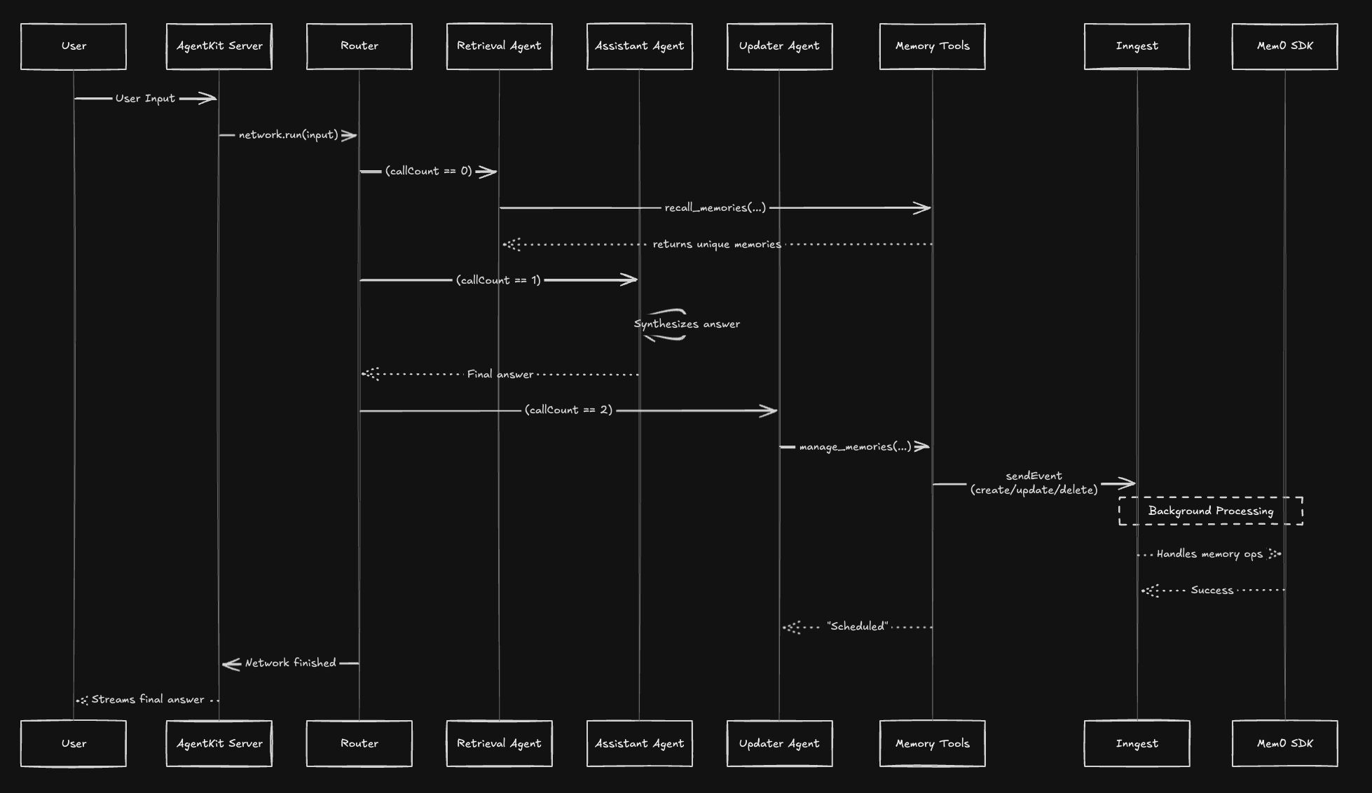 Starting with a memory recall agent to retrieve memories, then invoking an assistant agent (which could have many tools assigned to it) and then once a final answer tool is invoked by the assistant to produce a final, summarized response - a memory updater agent would be invoked and trigger a background job to create/update/delete any memories.