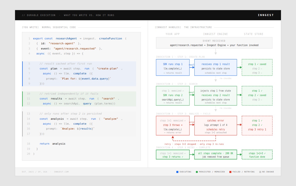 Durable execution also simplifies idempotency. Because step results are cached, you can safely retry the entire workflow without worrying about duplicate side effects. The durable execution engine ensures each step executes exactly once, even if the workflow function itself runs multiple times.